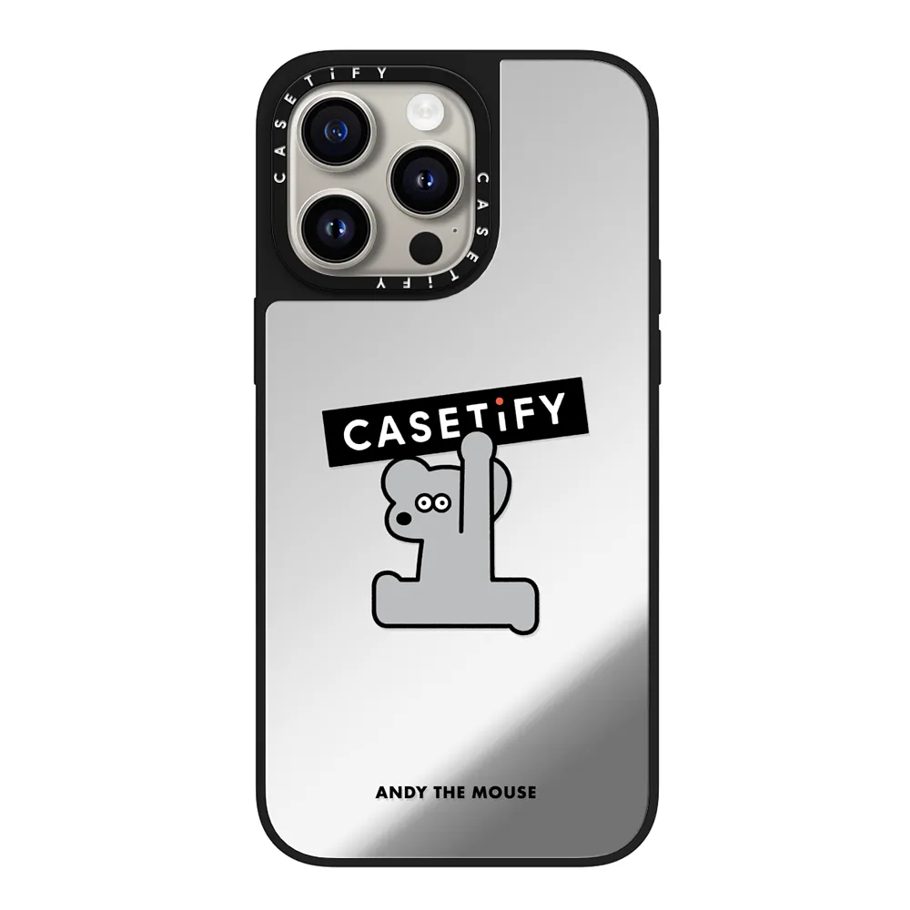 -Mirror Mouse Andy case displays an adorable print of Andy embracing the Casetify logo.