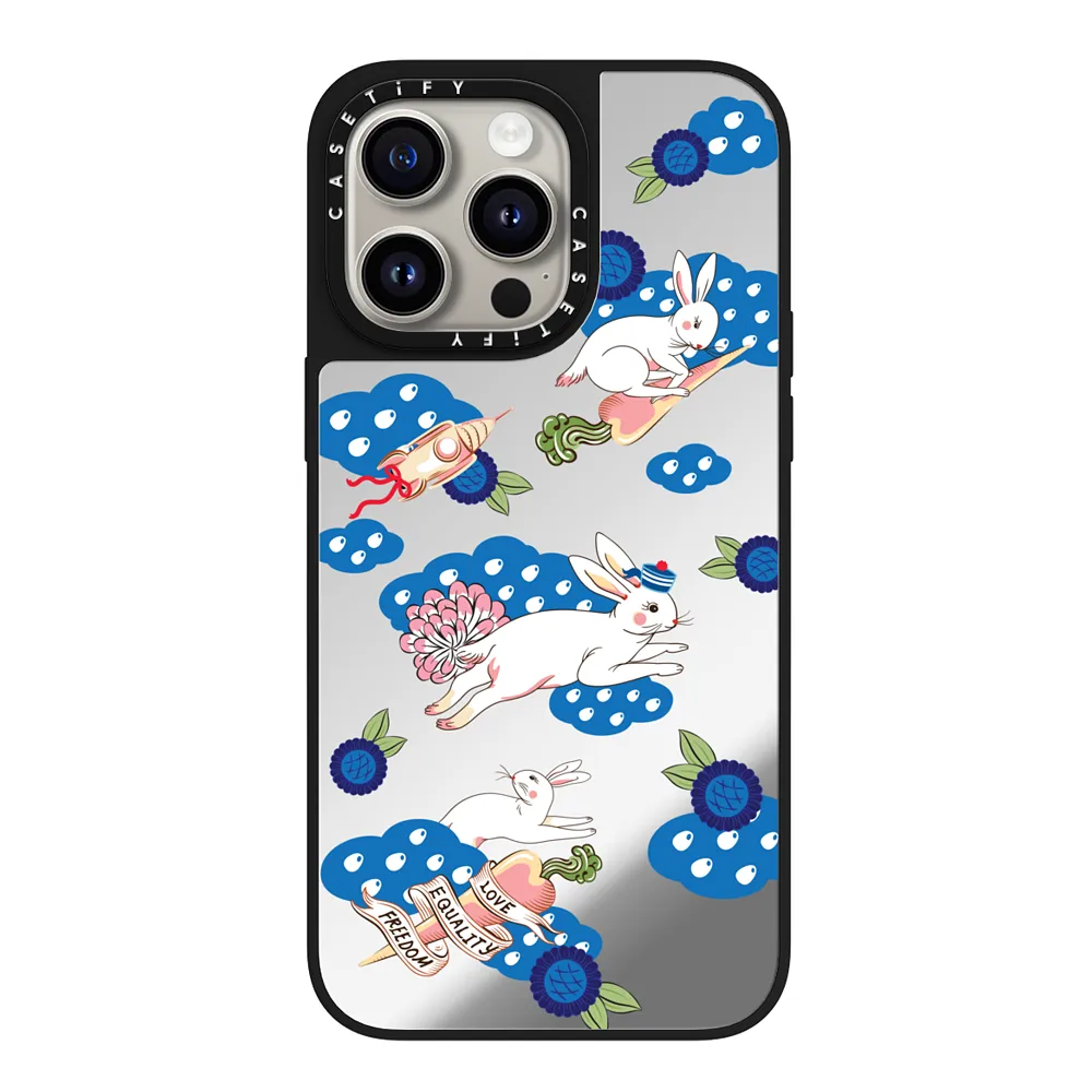 -Mirror case featuring cute rabbits jumping amid clouds for an aesthetically pleasing design.
