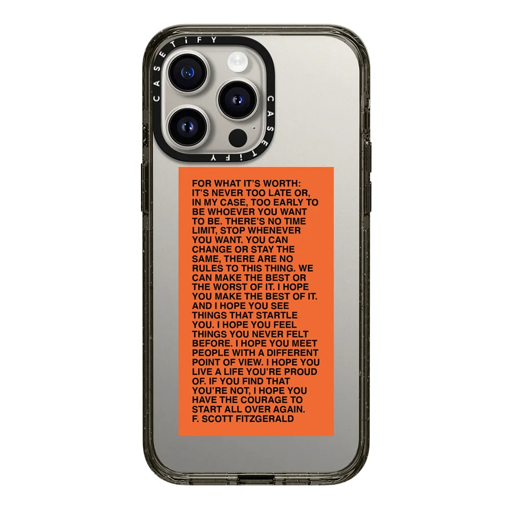 -Transparent case adorned with a vibrant orange sticker, inspiring you with a motivating quote.