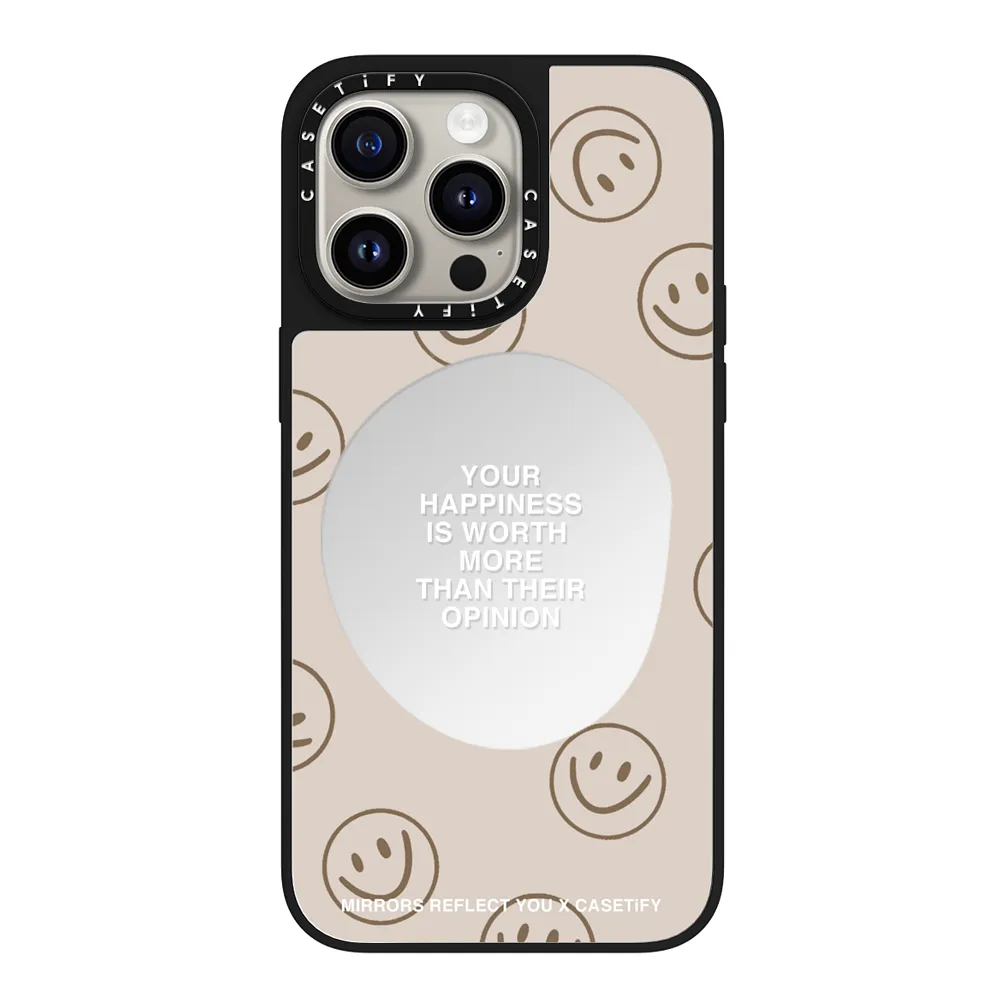 -Case adorned with smiley prints, featuring a center mirror and showcasing the inherent worth of happiness.