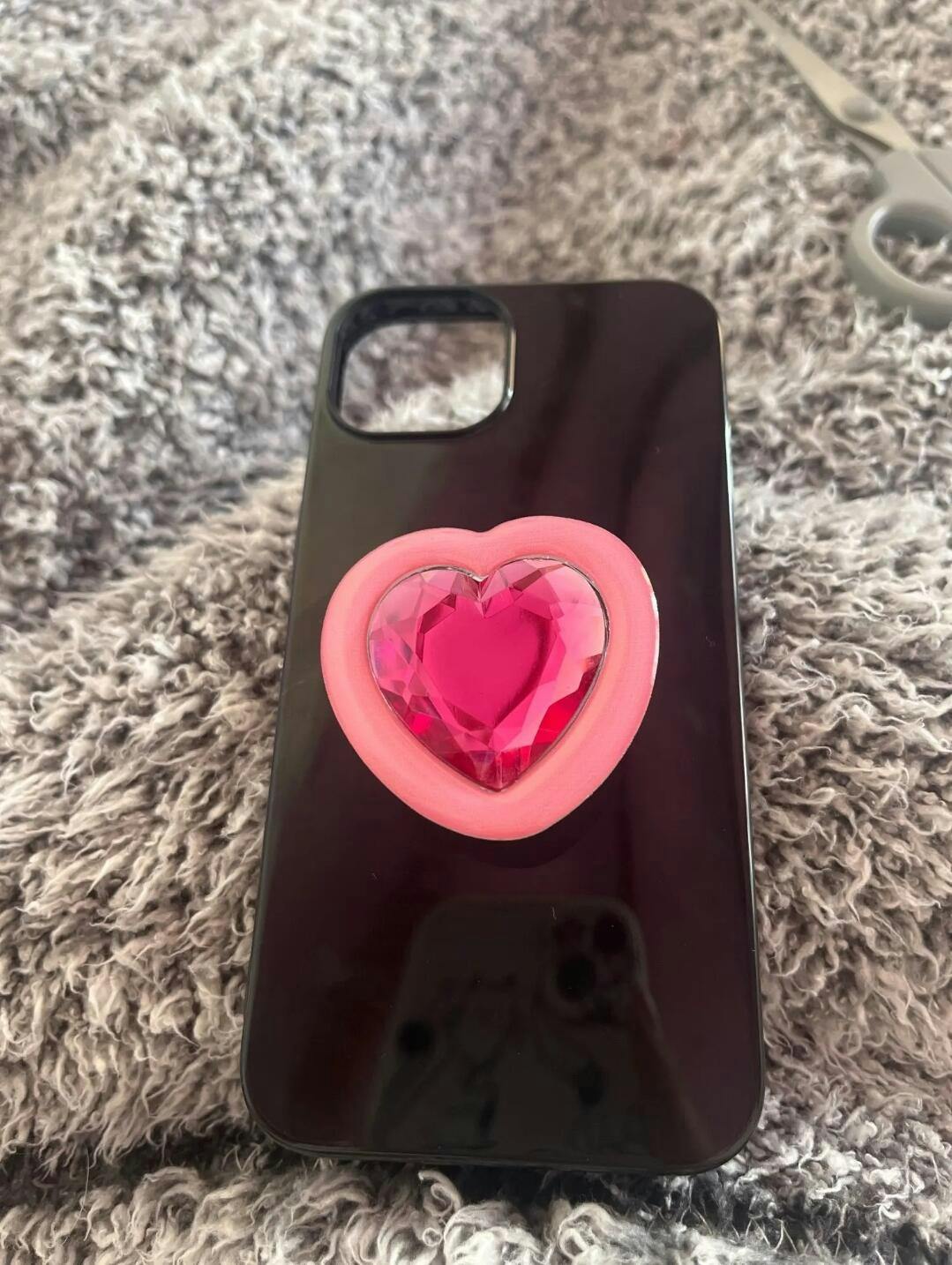 -Elevate your iPhone’s aesthetics with the charming pink heart bracket and crystal design on a sleek black case, providing a cute and protective touch.
