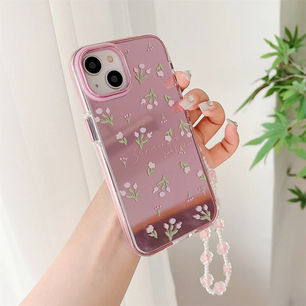 -Elevate your style with our pink glossy mirror case adorned with delightful floral prints, offering top-tier quality at an affordable price.